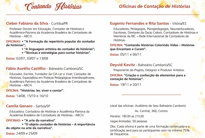 Eugênio Fernandes e Rita Santos convidados da www.cialereviver.com.brestaremos com grandes Contadores de história do Brasil participando e ministrando oficina no Projeto Contando Histórias - Oficinas. Patrocínio da Prefeitura e Fundação Cultural do Balneário de Camboriú no SESC em Santa Catarina. Obrigado Fábio Aurélio Castilho e Deyvid Kevitz. Todo sucesso para todos os envolvidos! Viva viva viva! + informações: https://www.facebook.com/events/600800336979917/?ti=icl