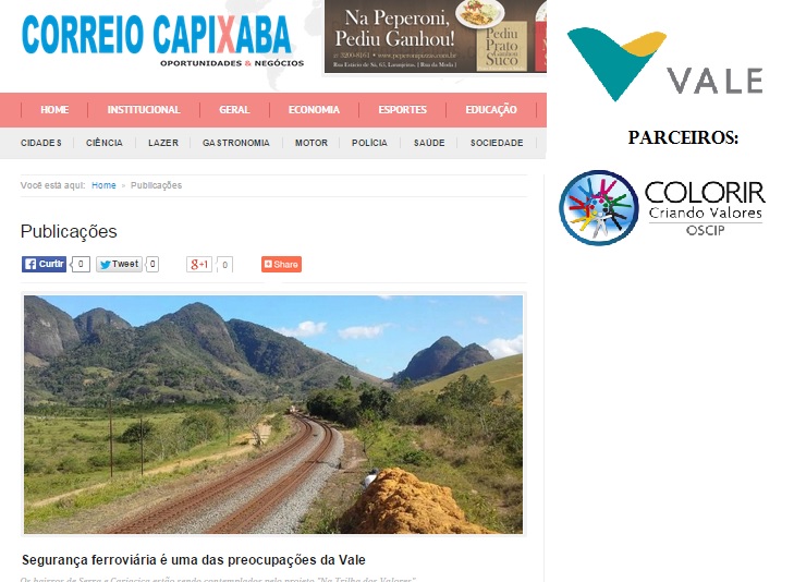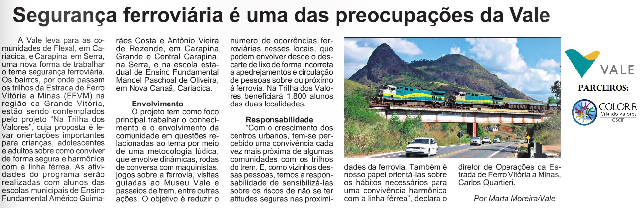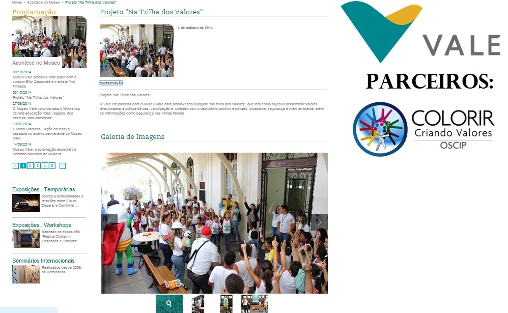 O PROJETO NA TRILHA DOS VALORES CRIADO, DESENVOLVIDO E APLICADO PELA OSCIP COLORIR EM PARCERIA COM A EMPRESA VALE - RELAÇÕES COM A COMUNIDADE TEM SIDO DESTAQUE EM SITES DA SOCIEDADE CAPIXABA.