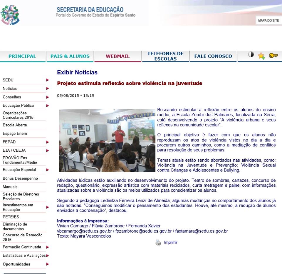 PROJETO VIOLÊNCIA E JUVENTUDE DESENVOLVIDO NA EEEFM ZUMBI DOS PALMARES COM A PARCERIA DA OSCIP COLORIR É DESTAQUE NO SITE DA SEDU - ESTADO.